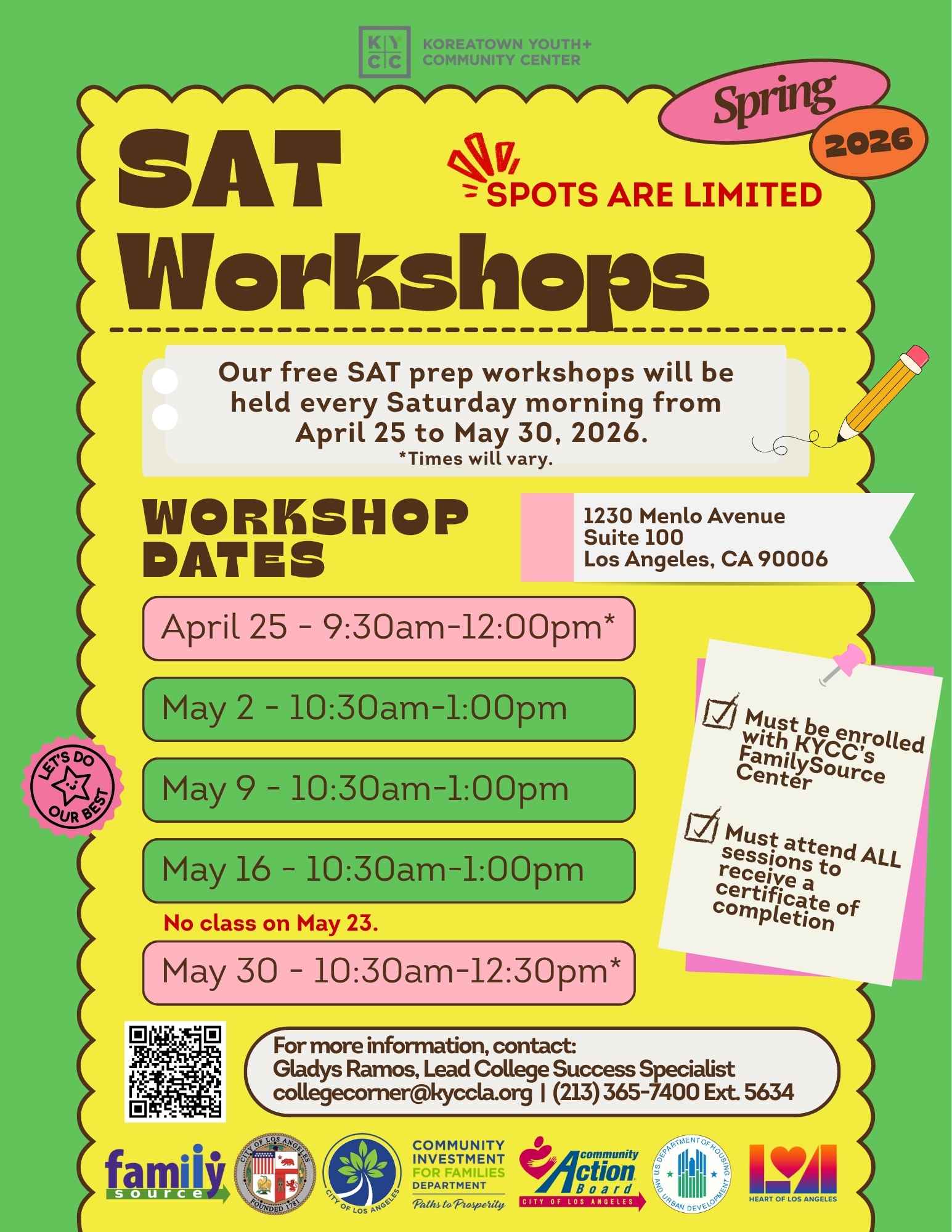 Join KYCC's College Corner for free SAT prep workshops from April 25 through May 30. Students must be enrolled with KYCC's Wilshire FamilySource Center to participate and those who attend …